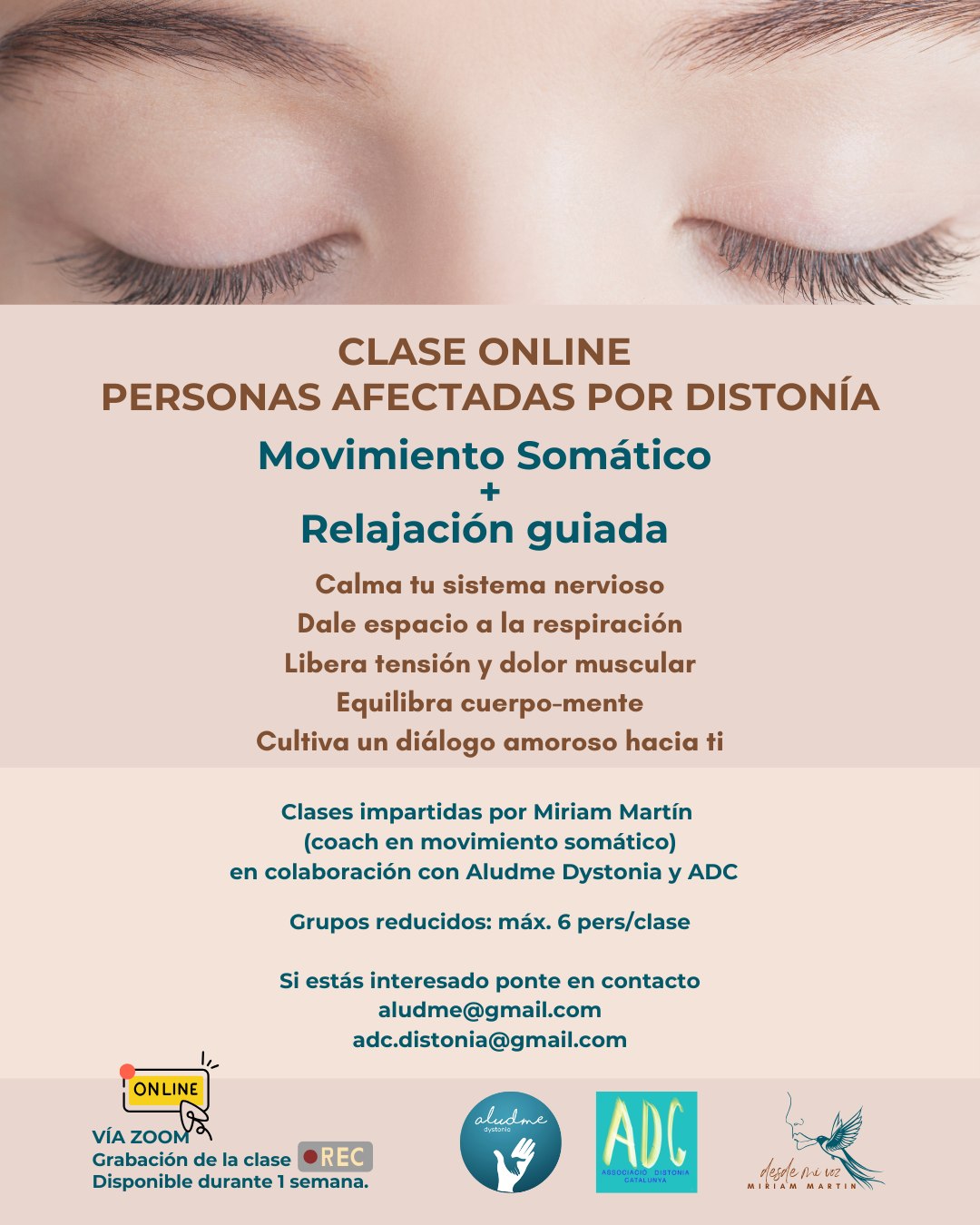 Desde Aludme Dystonia y Asociación Distonía Cataluña os recordamos que 𝐬𝐞𝐠𝐮𝐢𝐦𝐨𝐬 𝐢𝐦𝐩𝐮𝐥𝐬𝐚𝐧𝐝𝐨 𝐞𝐬𝐭𝐚𝐬 𝐜𝐥𝐚𝐬𝐞𝐬 𝐨𝐧𝐥𝐢𝐧𝐞 𝐩𝐞𝐧𝐬𝐚𝐝𝐚𝐬 𝐩𝐚𝐫𝐚 𝐩𝐞𝐫𝐬𝐨𝐧𝐚𝐬 𝐚𝐟𝐞𝐜𝐭𝐚𝐝𝐚𝐬 𝐩𝐨𝐫 𝐝𝐢𝐬𝐭𝐨𝐧𝐢́𝐚, guiadas por Miriam Martín, (coach en movimiento somático)